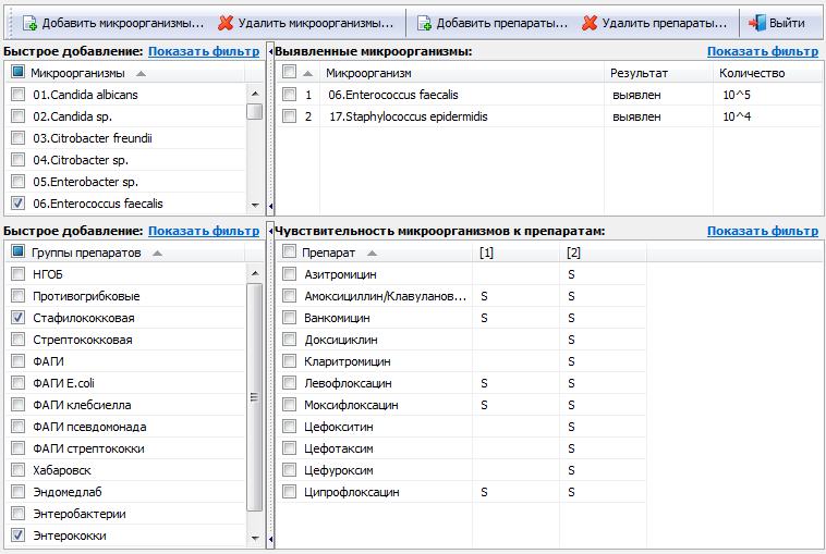 • Выдача результатов, включая выявленные микроорганизмы, антибиотикограмму, чувствительность к противогрибковым препаратам и бактериофагам. Поддерживаются бланки специализированных исследований, например, дисбактериоз кишечника.