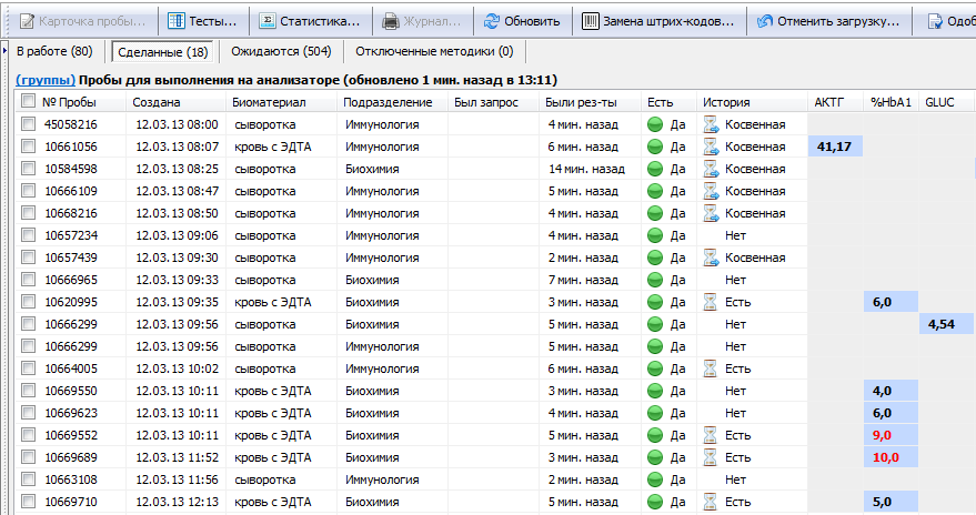 • Получить перечень пробирок, ожидающихся к выполнения на анализаторе; получить перечень пробирок, которые уже выполняются на анализаторе; получить перечень пробирок, которые уже выполнены в анализаторе, но еще не одобрены.