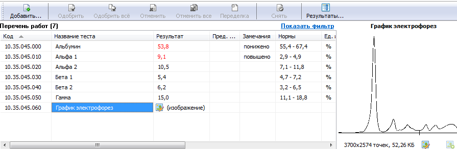 При получении результата с анализатора или вводе вручную система автоматически проверяет попадание результата в технический интервал. Если результат выходит за границы технического интервала, такой результат помечается заметным образом и его нельзя одобрить, только переделать. Для корректных результатов определяется попадание в норму и автоматически выставляется интерпретация (повышено, понижено или отрицательно, положительно и т.п.).