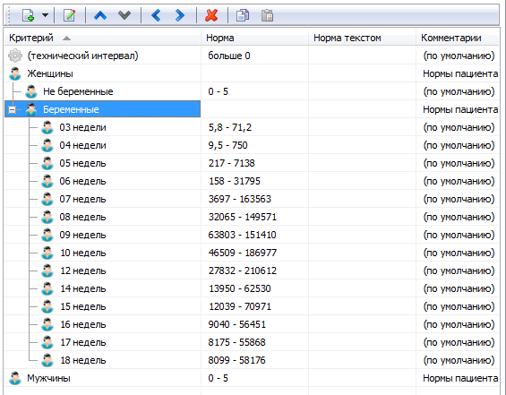 При регистрации направления для всех показателей автоматически определяются референсные интервалы по настройкам методик в справочниках. Поддерживается задание референсных интервалов по полу, возрасту, сроку беременности, фазе цикла, времени взятия биоматериала. Кроме этого возможно определение референсных интервалов по специальным критериям, например, курит/не курит, вид животного (для ветеринарных лабораторий) и др.